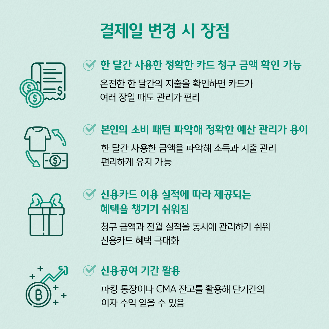누구나 사용하는 신용카드, 더욱 편리하고 현명하게 사용하려면 결제일부터 확인해 보세요. 카드결제일을 언제로 설정하느냐에 따라 한 달을 기준으로 현명한 지출과 계획적인 소비가 가능해집니다. 신용카드 결제일별 카드 이용 기간, 카드 결제일 변경 시 장점 등을 살펴보겠습니다.