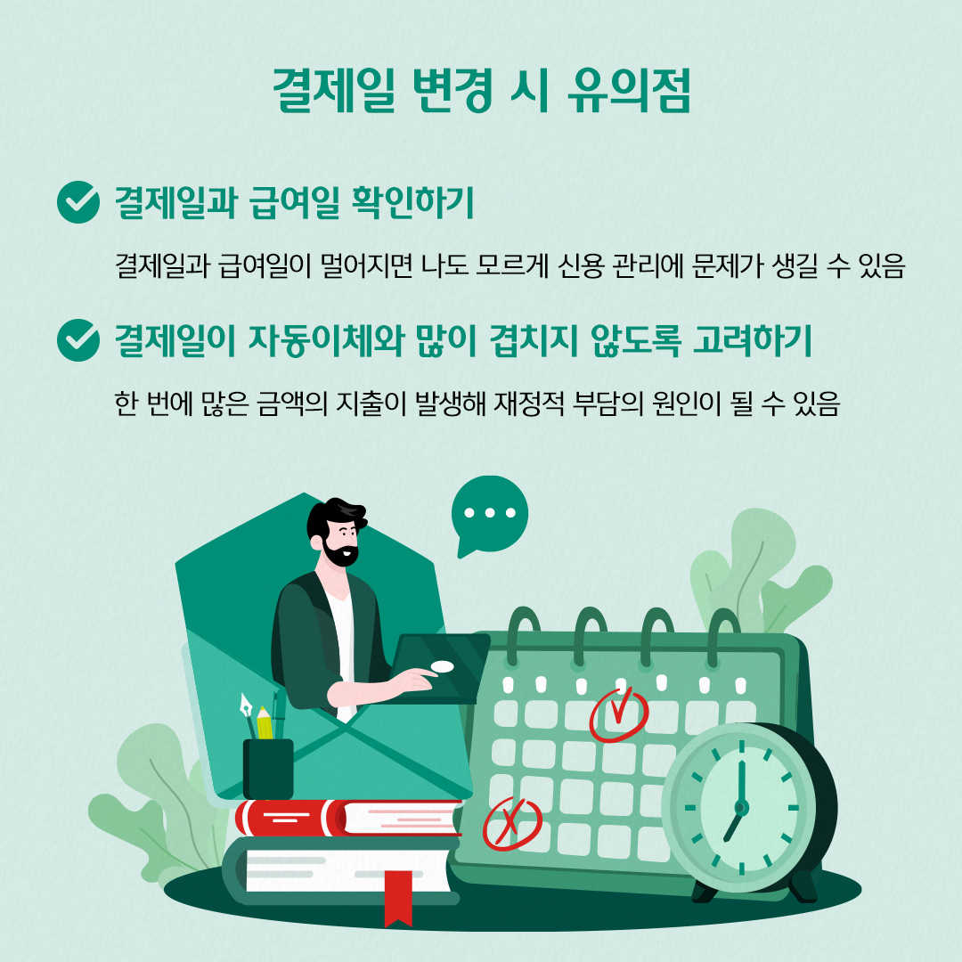 신용카드 결제일을 설정하기 전에 고려해야 할 점이 있습니다. 결제일을 변경하기 전에 자신의 급여일을 확인하고 결제일과 급여일의 간격이 너무 멀지 않도록 조정하는 것이 좋습니다. 결제일과 급여일이 멀어지면 나도 모르게 신용 관리에 문제가 생길 수 있습니다. 또한 결제일이 자동이체와 많이 겹치지 않도록 고려해야 합니다. 한꺼번에 많은 금액의 지출되면 재정적 부담의 원인이 될 수 있기 때문입니다.
