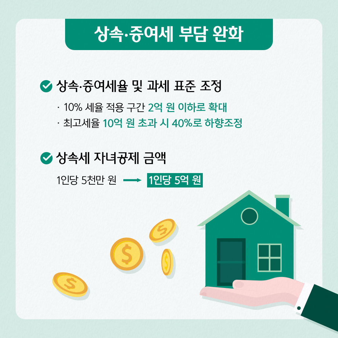 상속세 자녀공제 금액도 기존 1인당 5천만 원에서 5억 원으로 확대될 예정으로, 기초공제와 자녀공제 중 큰 값으로 상속공제 적용이 가능해짐에 따라 향후 상속·증여세 부담이 한층 낮아질 것으로 기대를 모으고 있습니다.