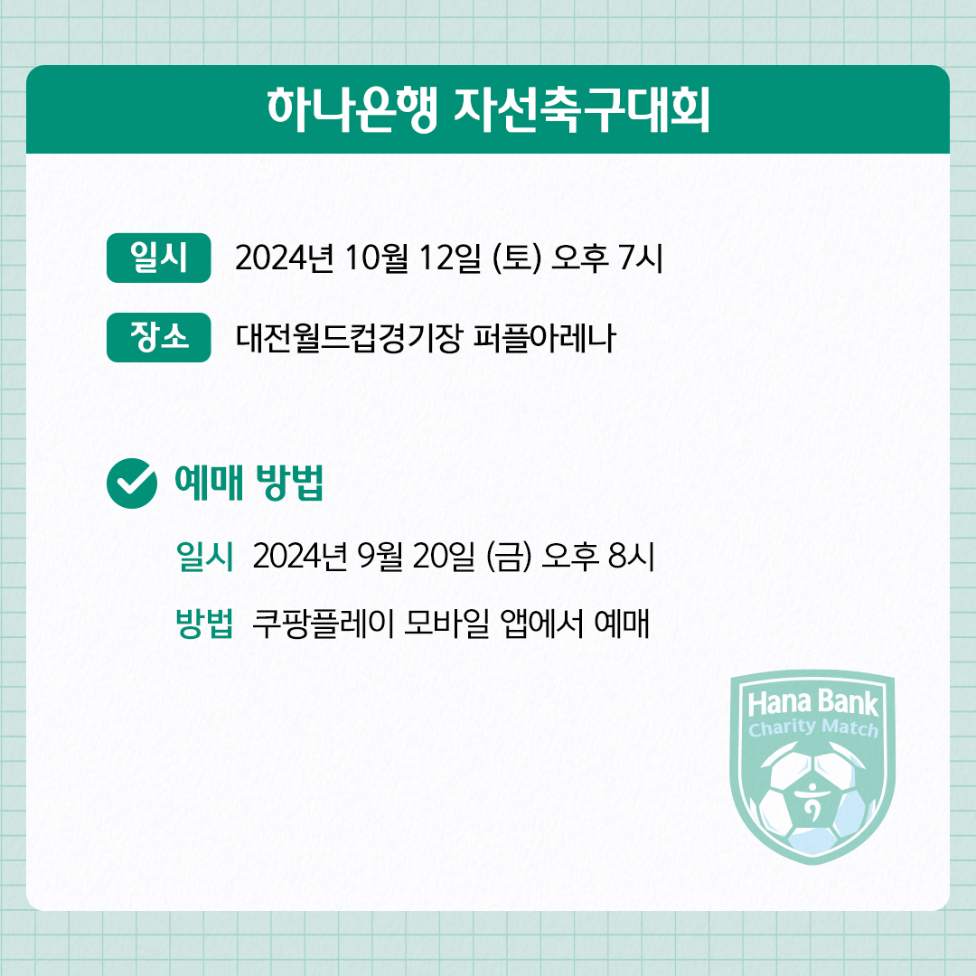 경기 티켓은 종이 티켓이 아닌 카드형 티켓으로 운영되며, 배송된 티켓의 취소, 변경, 환불이 필요할 경우 하나은행 자선축구회 고객센터(02-3402-5646)에서만 가능합니다. 이 외 자세한 티켓 예매 방법과 추가 라인업, 중계진 등 경기에 대한 상세 정보는 추후 쿠팡플레이 모바일 APP과 하나은행 공식 인스타그램(@hanabank_official)을 통해 공지될 예정이니 관심이 있으신 분들은 미리 팔로우하는 것도 잊지 마세요!