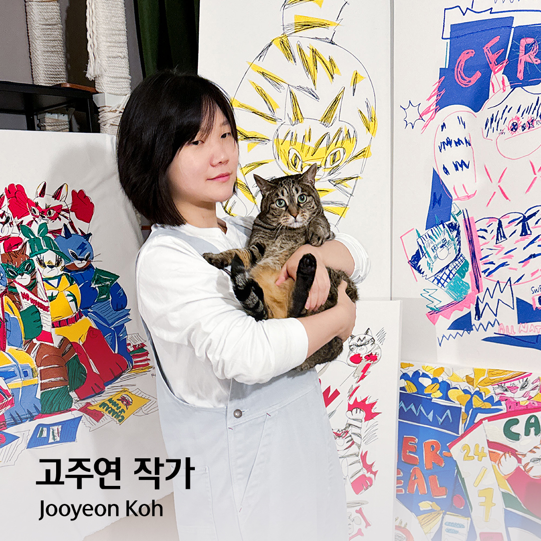 넷플릭스 화제작 <더 글로리>의 메인 포스터를 작업한 것으로 널리 이름을 알린 고주연 작가는 기계자수를 이용해 일러스트레이션 작업을 하는 신진 작가입니다. 얇게 이어지는 실 한 가닥 혹은 가는 연필의 흔적, 1픽셀 등의 작은 단위를 모아 그려낸 그림으로 세상 속 빈 곳을 채워가고 있습니다. 고양이가 지구를 구한다는 농담에서 시작된 ‘셔레이드 쇼’를 통해 트윕시와 고비 두 고양이의 모험 이야기를 펼치고 있습니다.