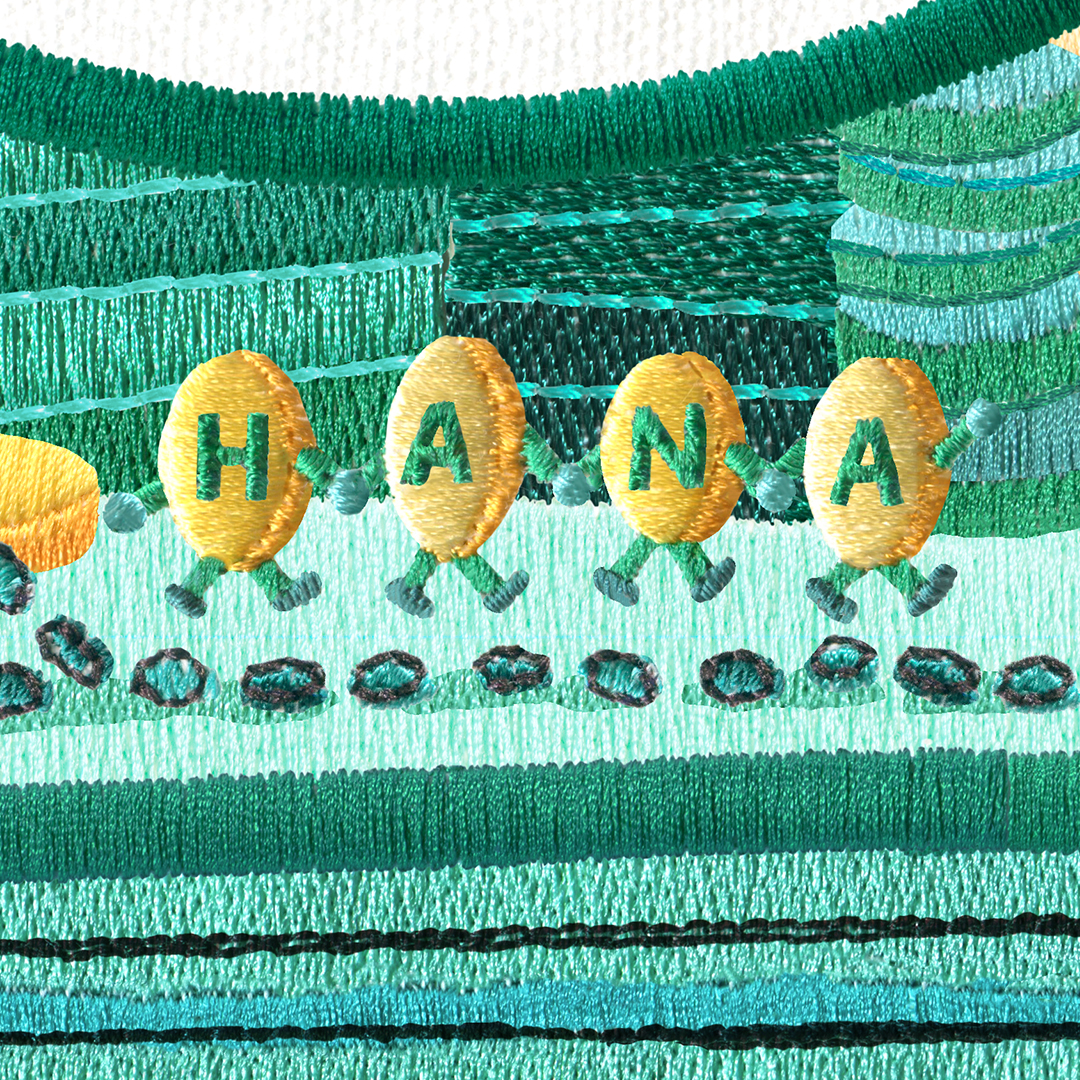 고주연 작가 “금융이라는 다소 딱딱한 주제를 어떻게 하면 더 친근하게 표현할 수 있을지 고민했습니다.금융과 하나은행의 가치를 상징하는 다양한 오브제를 유머러스하고 풀어내서 하나의 커다란 그림으로 만들어보면 좋겠다고 생각했습니다! 하나은행 팀에서도 적극적으로 아이디어를 보태주셔서 재밌는 이미지가 탄생할 수 있었습니다. 그리고 굿즈로 제작될 예정이었기 때문에 아트웍을 구성하는 각 요소들이 단독으로 사용할 경우에도 하나은행의 아이덴티티를 잘 살리면서 경쾌하게 표현될 수 있도록 노력했습니다.”