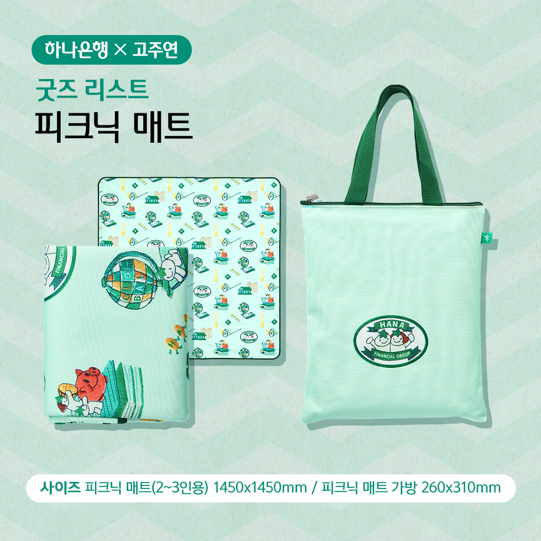 하나은행은 고객의 일상에 더 친근하게 다가가기 위해 일상에서 자주 사용하는 굿즈 품목을 고민했습니다. 실용성 있는 굿즈를 제작하기 위해 하나은행 공식 인스타그램에서 팔로워들을 대상으로 갖고 싶은 굿즈 품목을 직접 공모 받았고, 가장 수요가 높았던 항목 중에서도 활용도가 높은 품목으로 선정하여 제작했습니다. 그 결과 키치하고 힙한 키링, 보냉백, 마우스 패드, 피크닉 매트가 탄생했습니다.