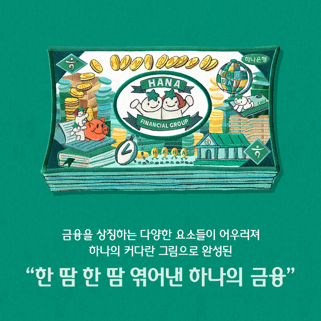 그렇게 하나은행과 고주연 작가가 만나 “한 땀 한 땀 엮어낸 하나의 금융”이 탄생했습니다. 하나은행의 마스코트인 별돌이와 별송이는 물론이고 은행, 통장, 동전, 저금통 등 금융을 상징하는 다양한 요소들이 조화롭게 어우러져 하나의 커다란 그림으로 완성되었습니다. 금융을 상징하는 오브제들이 모여서 하나의 커다란 그림이 되듯이 이 모든 금융 서비스가 긴밀하게 연결되어 있다는 메시지를 담고 있습니다.