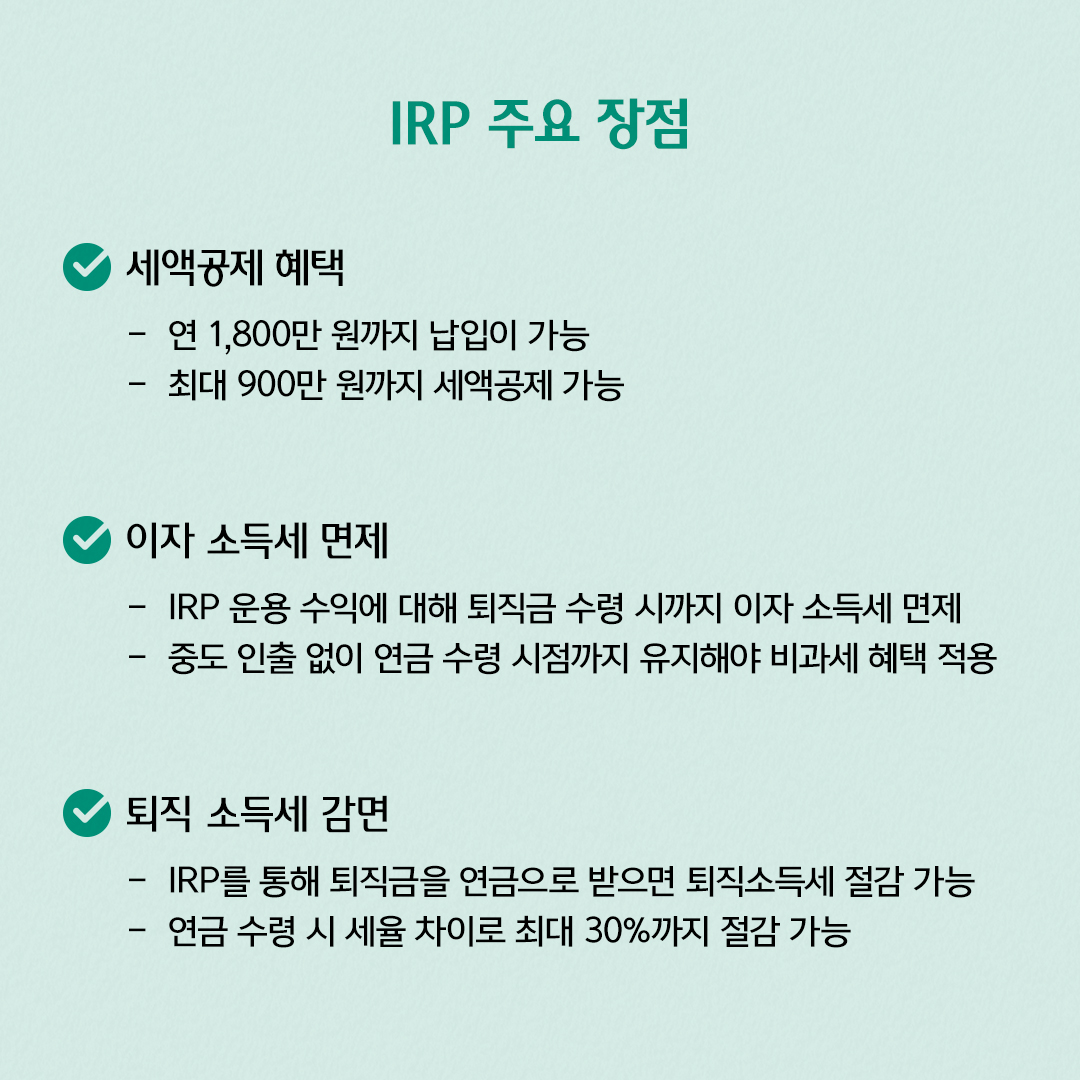 개인형 IRP 가입에서 가장 큰 장점은 세액 공제 혜택과 과세이연입니다.