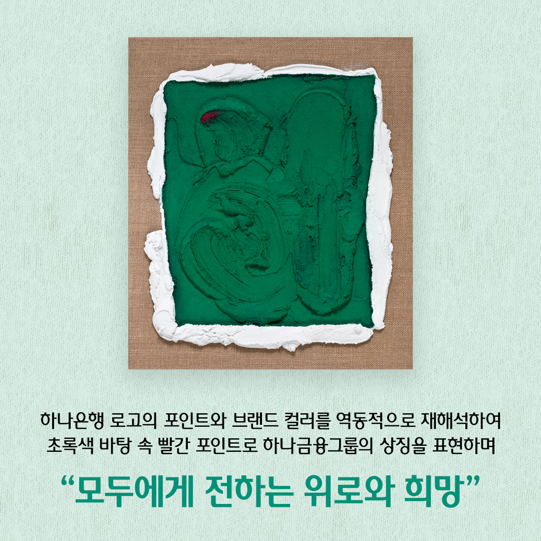 장마리아 작가 하나금융그룹 하면 ‘그린’과 ‘레드’가 저는 제일 먼저 생각이 나는데요. 그린 색상에서 떠오르는 ‘희망’의 메시지를 통해 ‘모두에게 전하는 위로와 희망’을 테마로 완성하였습니다. 그리고 봄 하면 생각나는 꽃이 피어나는 봉우리를 표현하고자 레드를 꽃이 피어나는 느낌처럼 나타냈습니다. 그린 컬러 위에 레드를 포인트로 찍어 제가 바라본 하나금융그룹을 예술적으로 형상화했습니다.
