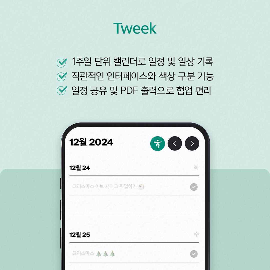 ‘Tweek’은 1주일 단위의 캘린더 뷰에 각 요일마다 할 일을 작성하고 일상을 기록하는 용도로 사용할 수 있습니다. 특히 미니멀하고 직관적인 인터페이스로 복잡한 설정 없이 사용법이 매우 간단합니다. 할 일은 주간 단위로 표시된 캘린더의 해당 일자를 클릭해 작성하고, 수정 방법은 해당 일자에 작성된 할 일을 클릭하면 나타나는 편집창에서 수정할 수 있습니다. 중요한 내용은 컬러로 구분해 표기하며, 한 주의 일정은 PDF나 프린터로 출력해 노트처럼 사용할 수 있어 편리합니다. 또한 팀원이나 가족과 해당 일정을 공유해 번거로운 미팅을 줄일 수 있습니다.