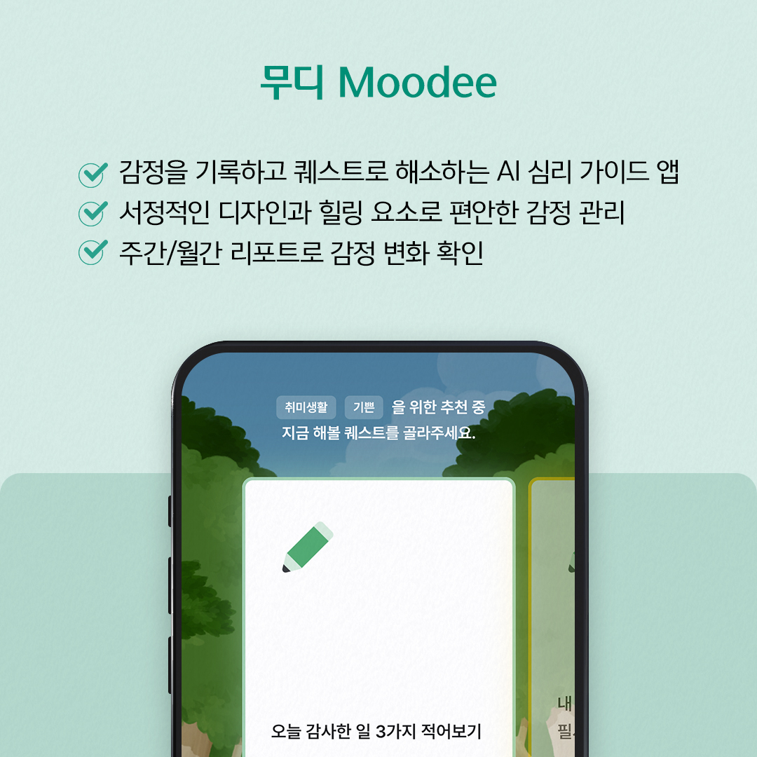 일상에 지쳐버린 감정들을 기록하는 ‘무디(Moodee)’는 개인의 감정을 관리하고 이해하는 데 도움을 주는 AI 심리 가이드 앱입니다. 자신의 감정을 일기처럼 기록하면, 그에 맞는 퀘스트를 추천받아 상처받은 감정을 해소하고 돕는 기능을 제공합니다. 서정적인 UX와 UI로 차분하고 편안한 무드에서 힐링을 주는 무디는, 메인 화면에서 현재의 기분을 나타내는 감정을 고르거나 메모하면 전문가의 분석에 따라 퀘스트가 주어집니다. 퀘스트를 달성하면 부정적인 감정은 덜어내고 상처받은 감정은 차츰 치유될 것입니다. 또한, 해당 감정들의 결과는 주간/월간, 우울/불안 체크 리포트를 통해 확인할 수 있어 건강 관리에 도움이 됩니다.