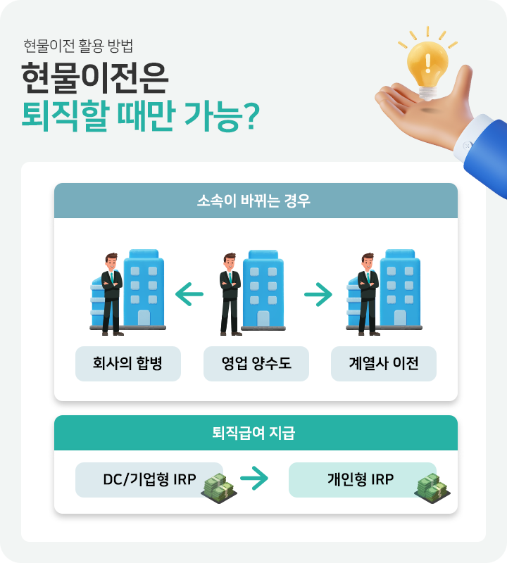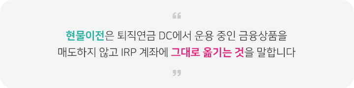 현물이전은 퇴직할 때만이 아니라 가입자의 소속이 바뀌는 경우에도 가능합니다. 가입자가 재직중인 회사의 합병, 영업 양수도, 관계사, 계열사 이전 등의 경우에 가능하고, 회사가 기업형IRP제도로 운용중인 경우에도 퇴직급여 신청할 때 IRP로 현물이전 가능합니다.