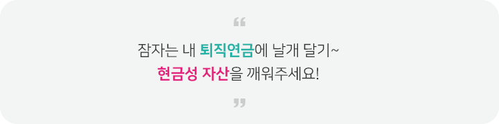 현금성자산은 퇴직연금계좌의 운용 상품을 정기예금이나 펀드 같은 특정한 상품으로 운용되지 않고, 고객님의 상품 선택을 기다리는 자금을 말합니다. 입출금 통장처럼 대기성 자금으로 운용되는데요. 대기성 자금이라 은행에서 시장금리 수준의 이율을 제공하지만, 시장금리 수준의 이율이기 때문에 변동 폭이 상당하고 수익률을 담보할 수 없어요. 그렇기 때문에, ‘연금의 수익률’을 높이기 위해서는 잠자고 있는 현금성자산을 깨워 적극적으로 활용하셔야 합니다!