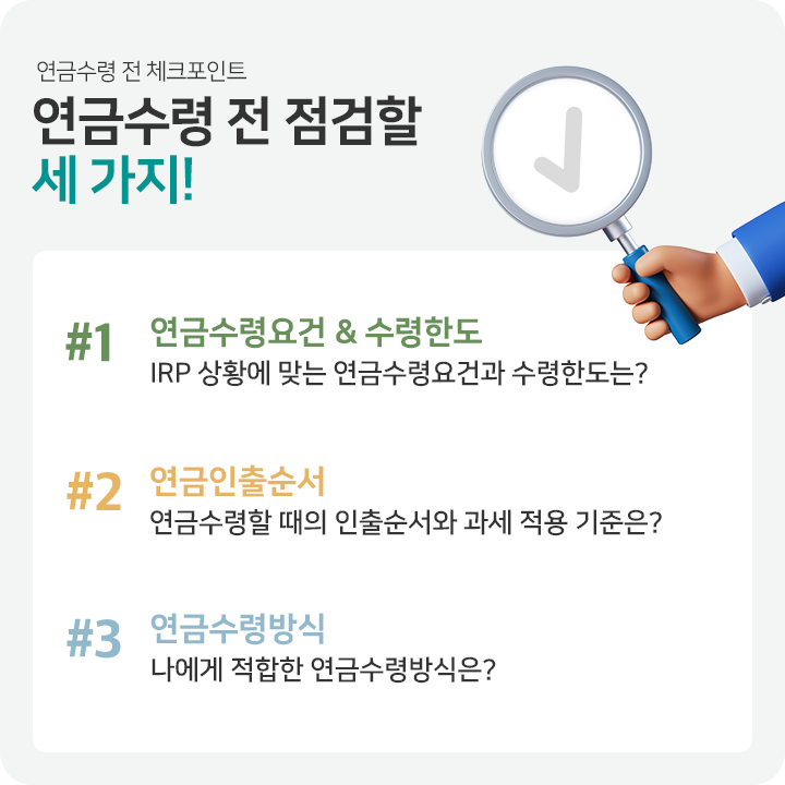 첫번째로 가입자가 가입한 IRP 상황에 맞는 연금수령요건과 연금을 얼마까지 받을 수 있는지 알아보고, 두번째로 연금을 받는다면 어떤 순서로 자금이 인출되는지, 그리고 세금은 어떻게 적용되는지 알아볼게요. 마지막으로 나에게 적합한 연금 수령 방식은 무엇인지 하나씩 차근차근 알려드릴게요.