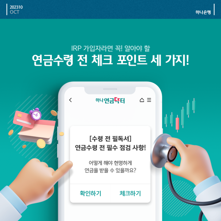 지금까지 하나연금닥터와 함께 연금수령 전 필독서, IRP 가입자라면 꼭 알아야 할 연금 받기 전 체크포인트 세 가지를 알아보았습니다.