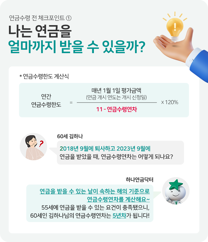 연금수령요건과 기간을 확인했다면, 연금수령한도에 대해 살펴볼 텐데요. 연금수령한도 란, 한 해에 연금을 최대 얼마까지 받을 수 있는지에 대한 한도를 말해요. 이를 계산하기 위해선 연금수령연차를 알아두셔야 하는데요. 여기서 말하는 연금수령연차는 실제 연금 받는 날의 기준이 아닌, 연금 수령 요건에 해당되는 날이 속하는 해의 기준으로 본답니다. 예를 들어, 김하나 님이 2018년 9월 55세에 퇴사를 하고, 2023년 60세에 연금을 받는다고 가정하면, 연금수령요건이 충족된 해, 즉 2018년 55세 기준으로 연금수령연차를 계산하여 김하나님의 연금수령연차는 5년으로 본답니다.그럼 김하나님의 연금수령한도를 계산해 보겠습니다.