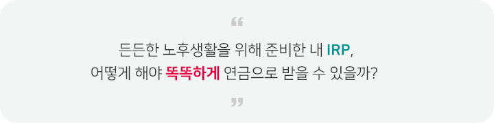 첫번째로 가입자가 가입한 IRP 상황에 맞는 연금수령요건과 연금을 얼마까지 받을 수 있는지 알아보고, 두번째로 연금을 받는다면 어떤 순서로 자금이 인출되는지, 그리고 세금은 어떻게 적용되는지 알아볼게요. 마지막으로 나에게 적합한 연금 수령 방식은 무엇인지 하나씩 차근차근 알려드릴게요.