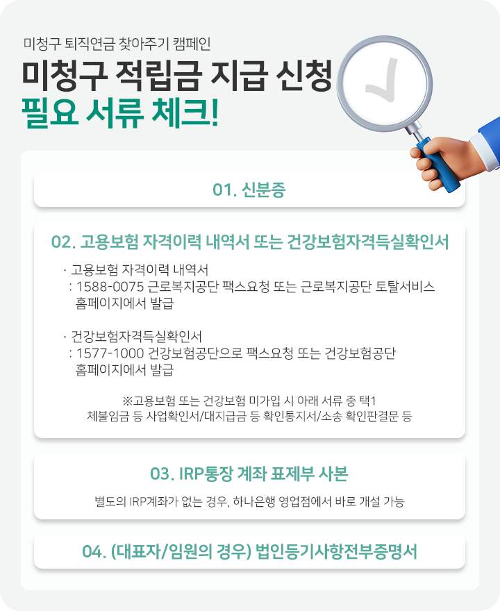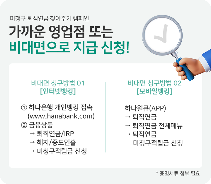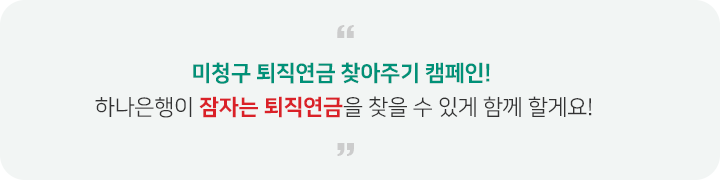 하나은행은 고용노동부, 금융위원회, 금융감독원과 함께 잠자는 퇴직연금 찾아주기 캠페인을 진행중이에요. 퇴직연금 미청구 적립금을 보유하고 있는 손님께 퇴직연금을 찾아가실 수 있도록 문자와 이메일을 발송하며 적극적으로 안내드리고 있어요. 통지를 받으신 손님께서는 은행방문 전 (또는 비대면 신청전) 필요한 서류를 체크하여 나도 모르는 퇴직연금이 있는지 꼭! 찾아가세요~