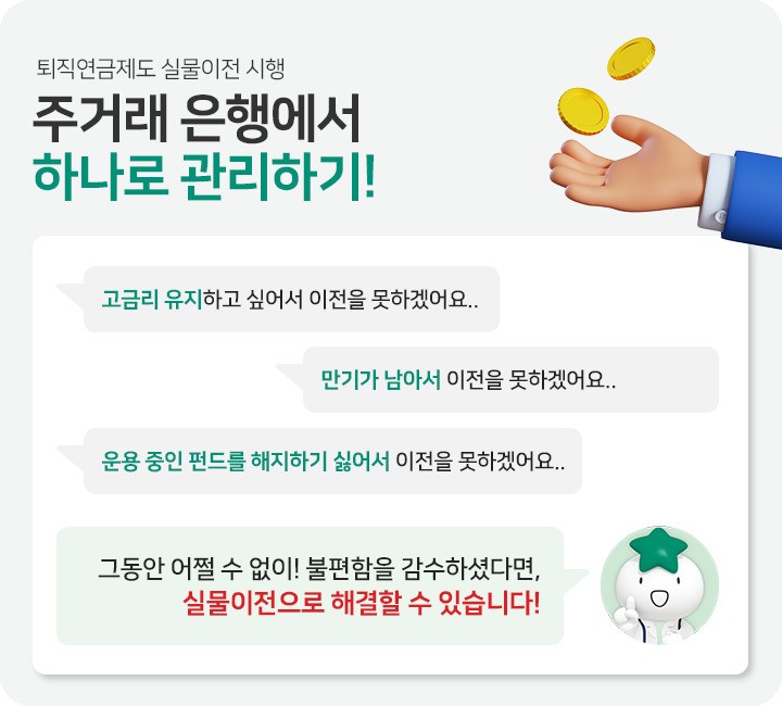 2024년 10월부터 고금리 상품, 만기가 남은 정기예금, 운용하고 있던 펀드도 운용 중이던 상품 그!대!로! 옮겨서 관리할 수 있어요. 실물이전을 이용해서 내가 익숙하고, 나를 잘 아는 주거래 은행으로 내 연금자산(IRP)을 옮겨서 하나로 관리해 보아요.