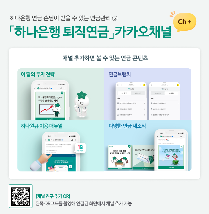 「하나은행 퇴직연금」 카카오채널에서는 쉽고 빠르게 연금 정보를 확인할 수 있어요. 하나연금닥터가 매달 시황과 상품 포트폴리오를 추천해주는 '이달의 투자 전략(연금처방전)'부터 자주 사용하는 메뉴 모음을 한눈에 볼 수 있는 '연금브랜치', 모바일 하나원큐 이용 매뉴얼, 다양한 연금 새소식까지 유용한 연금 콘텐츠를 한번에 만나 볼 수 있어요. 뿐만 아니라, 하나은행 연금손님께는 퇴직연금 제도 변화와 놓치면 안 될 정보를 알림톡까지 보내주어 일상 속에서도 스마트한 연금 관리를 도와준답니다.