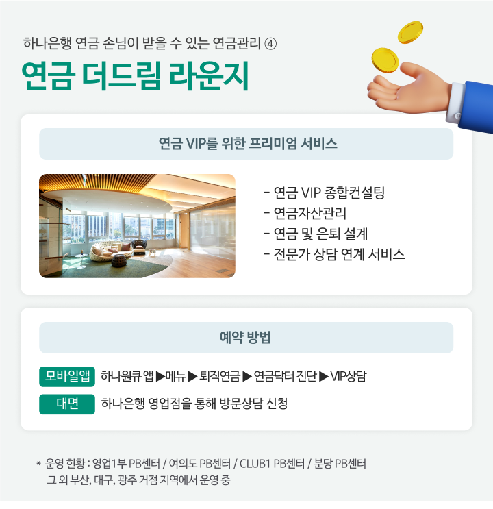 ※연금 더 드림 라운지는 하나은행 IRP/DC에 1억 이상 보유한 개인 손님을 전문 상담하는 대면 채널입니다.
