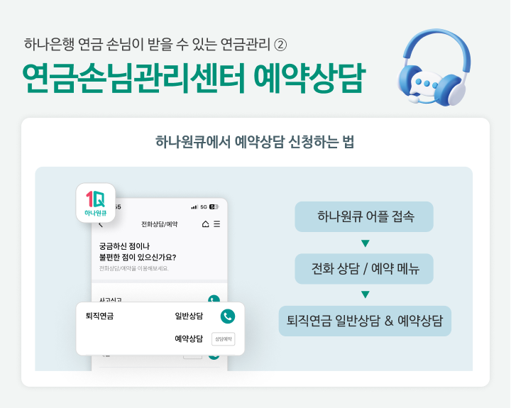 은행에 방문할 시간을 내기 어렵다면 퇴직연금 전용 상담 팀인 연금손님관리센터를 이용해 보세요. 하나원큐 ‘전화 상담 / 예약’ 메뉴에서 간단히 예약하고, 연금 전담 직원의 심층 상담을 받을 수 있어요. 장소에 구애받지 않고 편리한 상담을 원하는 손님들에게 꼭 맞는 연금 관리 서비스입니다.