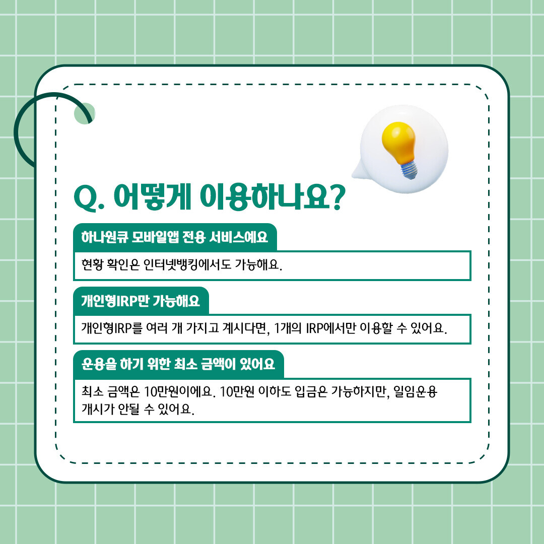 • 자세한 사항은 하나은행 퇴직연금 홈페이지(https://pension.hanabank.com), 모바일앱(하나원큐)을 참고하시거나, 하나은행 퇴직연금 전용 고객센터 1599-2080[운영시간(영업일 09:00~18:00)] 또는 영업점으로 문의하시기 바랍니다.