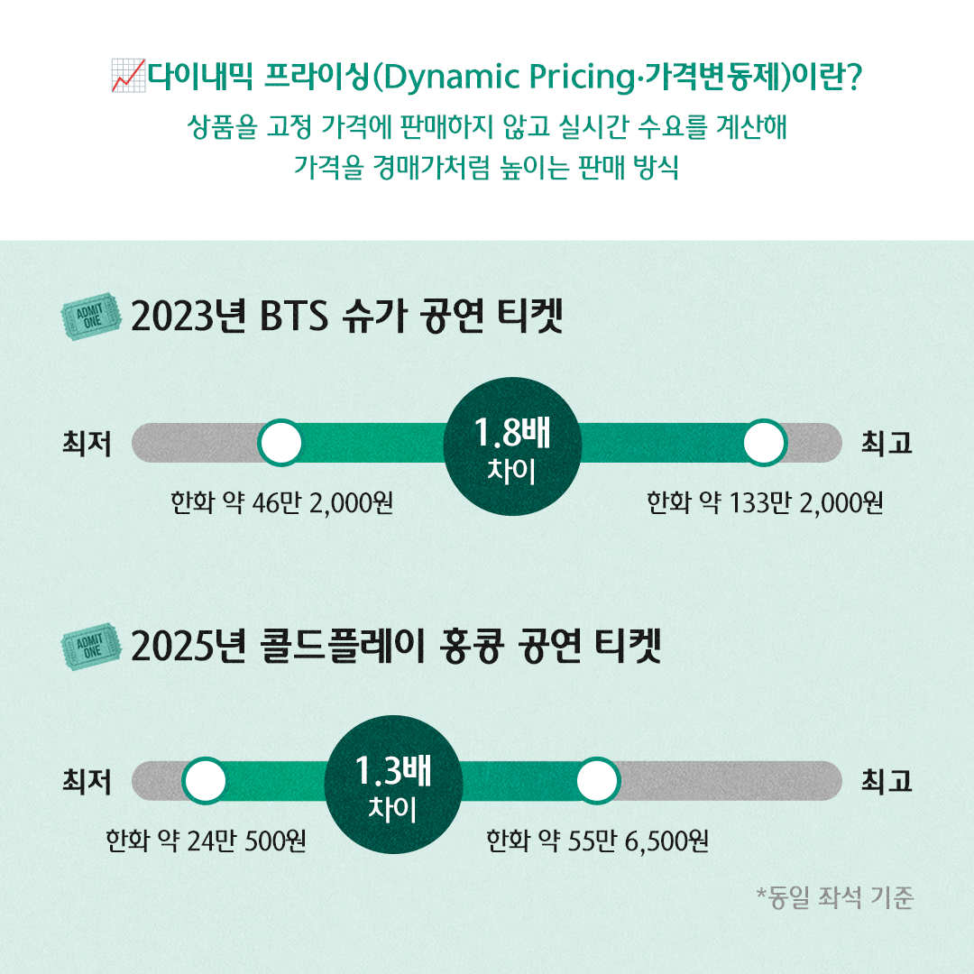 최근에는 ‘다이내믹 프라이싱(Dynamic Pricing·가격변동제)’를 일부 콘서트에 적용하며 티켓 가격이 실시간으로 변하기도 했어요.📈 세계적인 인기를 구가하는 아티스트의 공연일수록, 천정부지로 티켓 가격이 오를 수밖에 없는데요, 2023년 BTS 슈가의 공연 티켓은 정상가의 3배가량 치솟은 사례도 있었죠. 20만 원짜리 좌석을 선택했더라도, 막상 예매가 완료된 시점에는 30만 원이 되기도 합니다. 결제를 진행하는 그 짧은 순간에도 많은 팬들이 몰렸기 때문이지요. 이런 시스템은 아직 팬들에게 혼란스럽기도 해요. 예매에 집중하느라 가격 확인을 못 한 채 결제하고, 나중에 ‘이게 뭐야?’ 하며 당황하는 경우도 많습니다.