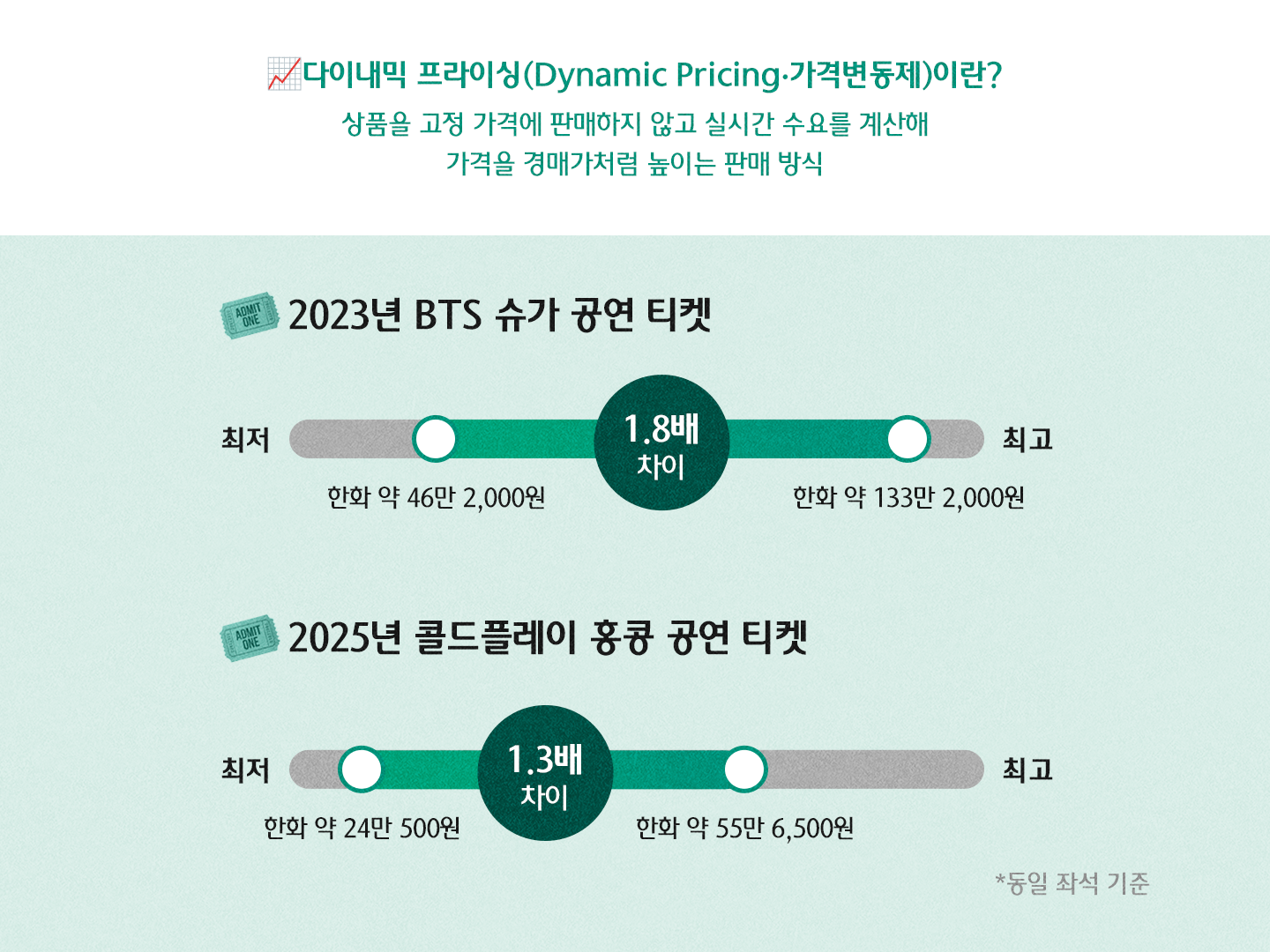 최근에는 ‘다이내믹 프라이싱(Dynamic Pricing·가격변동제)’를 일부 콘서트에 적용하며 티켓 가격이 실시간으로 변하기도 했어요.📈 세계적인 인기를 구가하는 아티스트의 공연일수록, 천정부지로 티켓 가격이 오를 수밖에 없는데요, 2023년 BTS 슈가의 공연 티켓은 정상가의 3배가량 치솟은 사례도 있었죠. 20만 원짜리 좌석을 선택했더라도, 막상 예매가 완료된 시점에는 30만 원이 되기도 합니다. 결제를 진행하는 그 짧은 순간에도 많은 팬들이 몰렸기 때문이지요. 이런 시스템은 아직 팬들에게 혼란스럽기도 해요. 예매에 집중하느라 가격 확인을 못 한 채 결제하고, 나중에 ‘이게 뭐야?’ 하며 당황하는 경우도 많습니다.