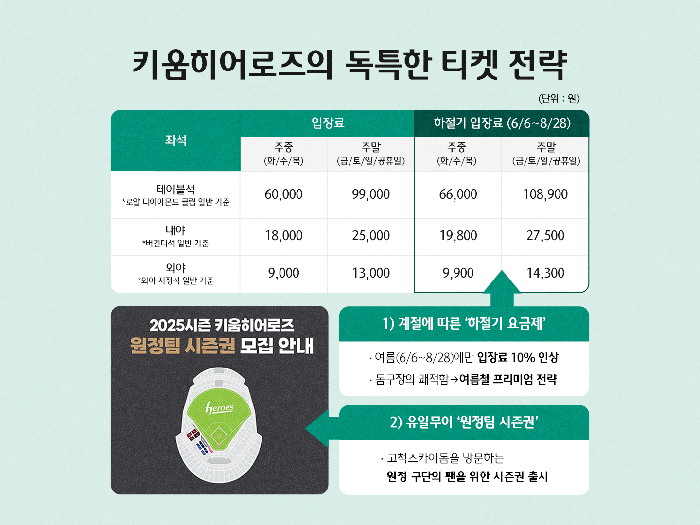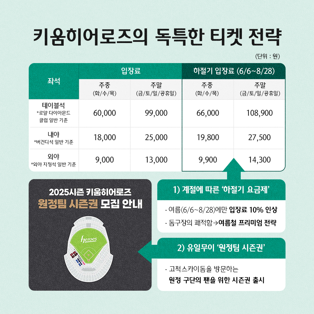 특히 키움히어로즈의 경우에는 독특한 티켓 판매 정책으로 눈에 띄는데요. 하절기에만 홈 시즌권 티켓 가격을 10%을 올리는 ‘계절별 요금제’를 운영해요. 이는 돔 형태의 고척 스카이돔이 무더운 여름철 타 구장에 비해 상대적으로 쾌적하다는 점을 반영한 전략입니다.🏟️