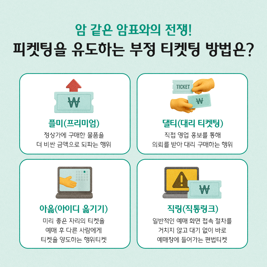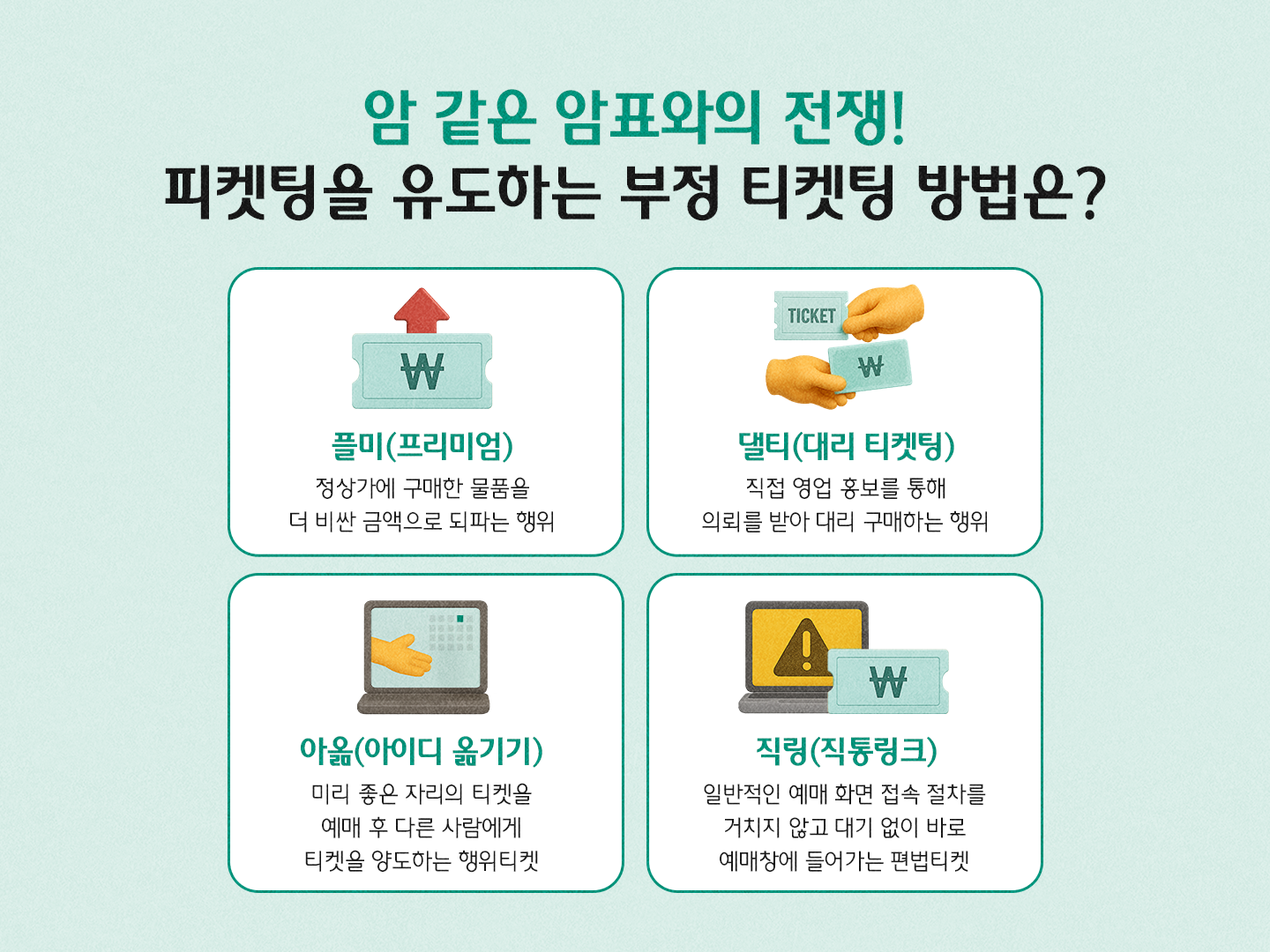 운동화를 미리 구매하고 이를 다시 파는 리셀 행위가 재테크 방법으로 떠오른 지 오래인데요. 최근 티켓 구매와 관련한 다양한 편법들이 단순한 개인의 일탈을 넘어 구조적인 시장 문제로 인식되고 있어요. 티켓 '플미'는 '프리미엄(premium)'의 준말로 티켓, 앨범 등 정상가에 구매한 물품을 더 비싼 금액으로 되파는 행위를 말하는데요. 스포츠나 공연 티켓에서는 암표를 우회적으로 세탁하는 단어라고 할 수 있어요. 뿐만 아니라 ‘댈티(대리 티켓팅)’, ‘아옮(아이디 옮기기)’, ‘직링(직통 링크)’ 등은 매크로 프로그램이나 우회 경로를 통해 공식 예매 시스템의 허점을 파고드는 방식인데요. 이러한 방식을 통해서 전문 구매 대행업자나 암표상이 수월하게 티켓을 판매할 수 있는 거죠.💵 다만 이렇게 암표 구매를 의뢰했다가 실패하는 경우, 원금조차 돌려받지 못하는 경우도 빈번해요.
