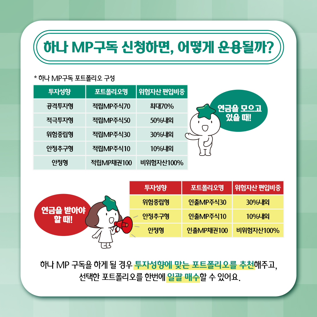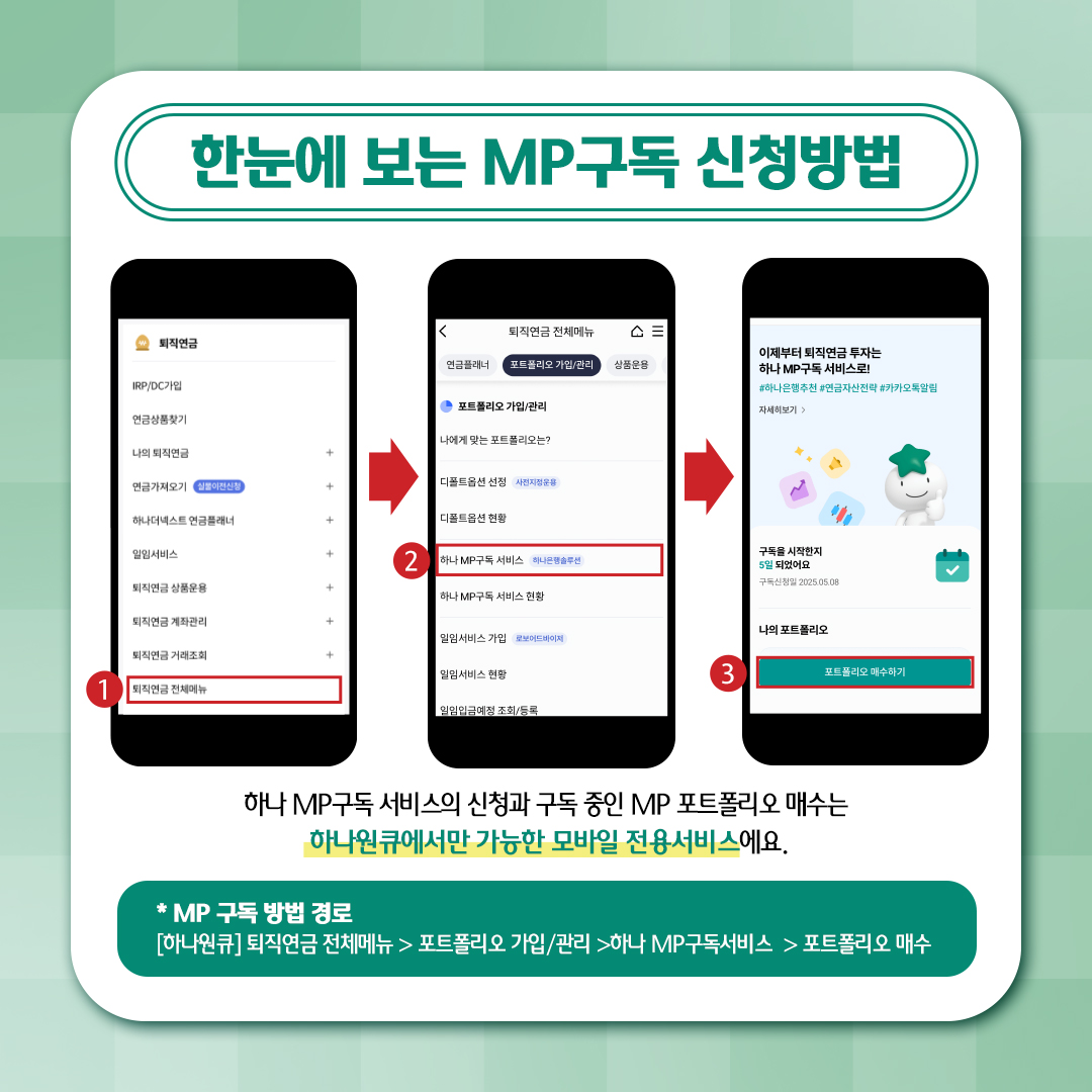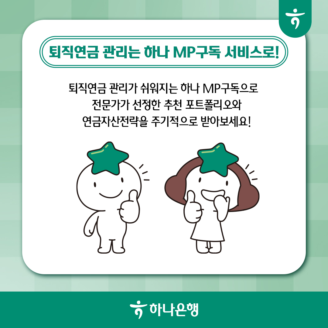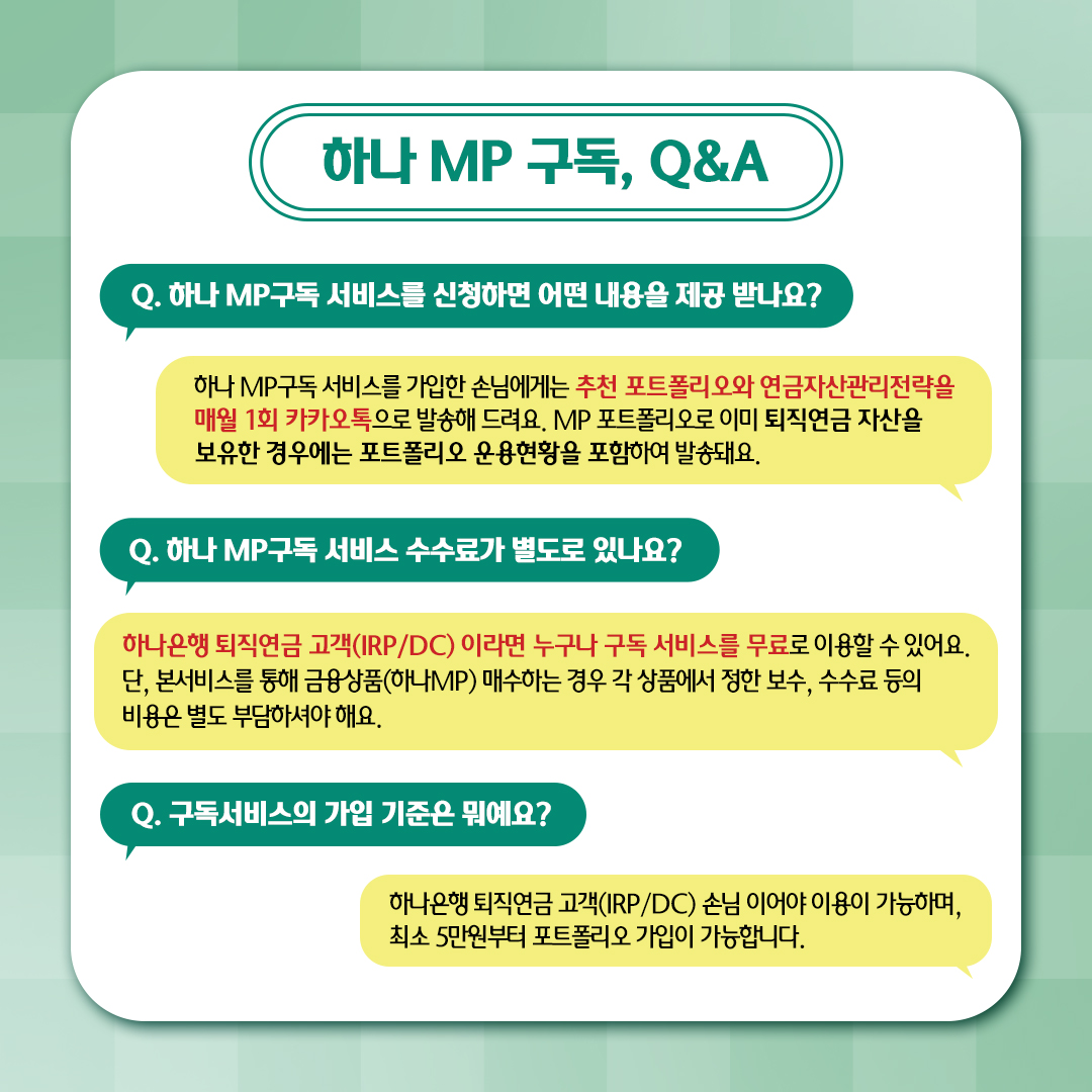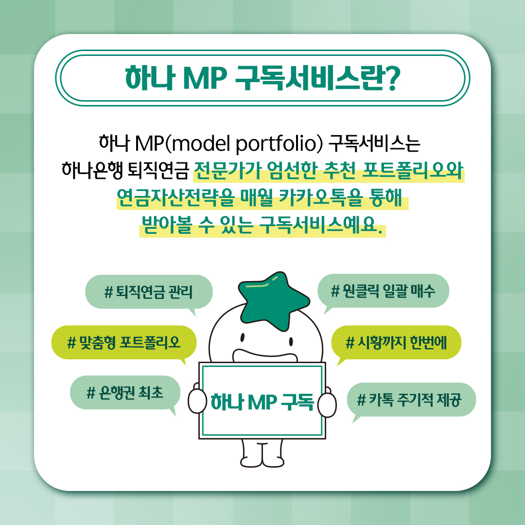 ※ 하나 MP구독 서비스는 하나은행 퇴직연금 전문가가 선정한 포트폴리오와 연금자산전략을 매월 카카오톡으로 받아보고 고객의 투자성향에 맞는 포트폴리오를 선택할 수 있는 포트폴리오 구독 서비스 입니다.