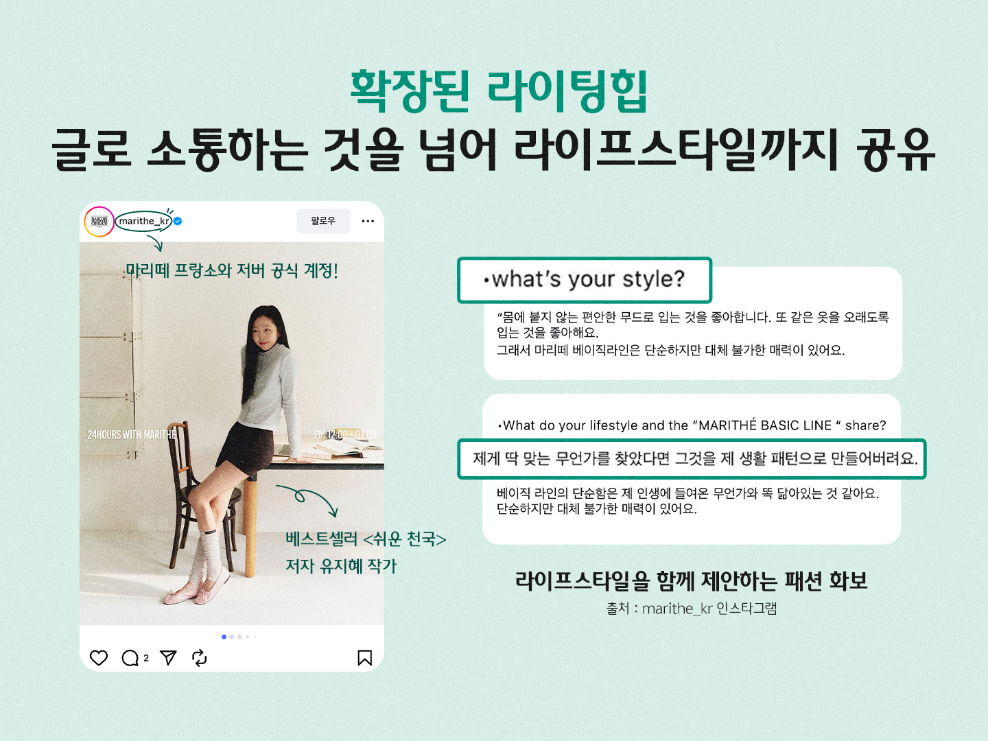 실제로 프렌치 무드의 캐주얼 브랜드 마리떼 프랑소와 저버(MARITHE FRANCOIS GIRBAUD)의 2025 S/S 캠페인에서는 유지혜 작가를 모델로 기용했습니다. 이는 단순한 패션 화보가 아니라 글을 쓰는 라이프스타일을 제안하는 콘텐츠이기에 더욱 많은 공감을 받을 수 있었습니다.