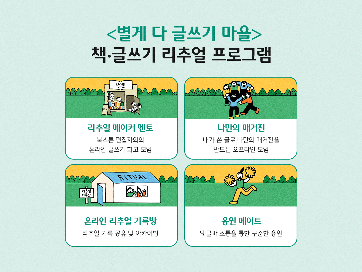 출판사 북스톤과 자기돌봄 커뮤니티 플랫폼 밑미(meet me)가 함께 운영중인 ‘별게 다 글쓰기 마을’은 이런 흐름을 대표적으로 보여주고 있습니다. 이는 하루 5분, 아주 짧은 시간이라도 글을 쓰는 습관을 만드는 챌린지 프로그램인데요. 중요한 것은 완성도 높은 글을 써야 한다는 압박감이 아닌 무엇이든 써보는 경험을 반복하는 ‘과정’에 있습니다.