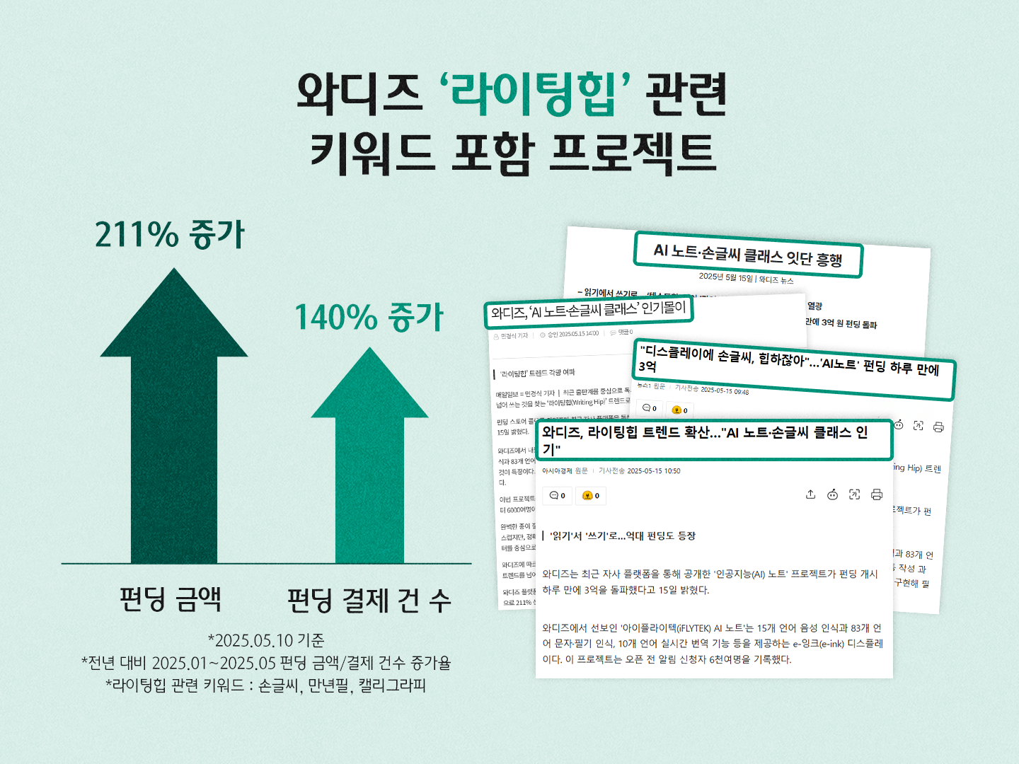 디지털 영역의 ‘쓰기’에서도 새로운 변화가 보이는데요. 와디즈에서 공개된 AI 기반 디지털 노트는 펀딩 하루만에 3억 원을 돌파하며 큰 반응을 얻었습니다. 디지털 도구로도 손의 감각을 살리는 글쓰기가 소비자에게는 중요한 포인트가 되었는데요. 이제 감정을 기록하고 생각을 정리하는 쓰기는 단순한 작성의 의미를 넘어, 정서적 효능감을 주는 콘텐츠로 진화하고 있습니다.