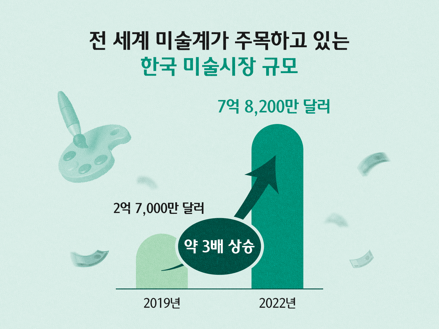 당시 한국에서는 서울옥션 등 미술품 거래 플랫폼들이 등장하면서, 미술품 수집과 관람에 대한 관심이 커졌어요. 연예인들이 작가로 데뷔하고, 전시 등을 관람하며 인증한 것도 영향을 줬죠. 이런 변화는 2019년에서 2022년까지 한국 미술시장 규모가 3배 가까이 급성장하는 결과로 나타났어요.