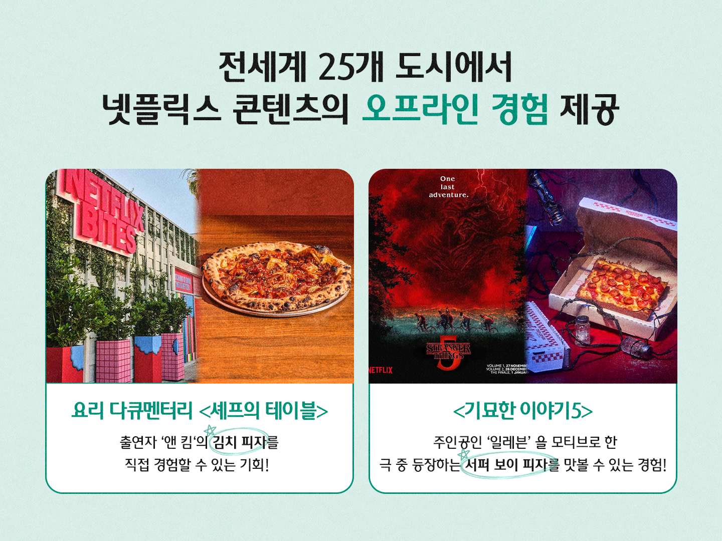 사실 넷플릭스는 예전부터 콘텐츠를 현실 세계로 옮기는 실험을 진행해 왔어요. 그동안 전 세계 25개 도시에서 팝업 등 체험 공간을 열었거든요. 형태도 다양했어요. 2023년 6월에는 LA에서 글로벌 스타 셰프들을 조명하는 ‘셰프의 테이블(Chef’s Table)’ 속 메뉴를 만날 수 있는 ‘넷플릭스 바이츠(Netflix Bites)’를 열었죠.🍕 또 올해 2월에는 드라마 ‘브리저튼(Bridgerton)’, ‘웬즈데이(Wednesday)’ 등 인기 콘텐츠들을 테마로 한 파격적인 메뉴들도 선보였고요.