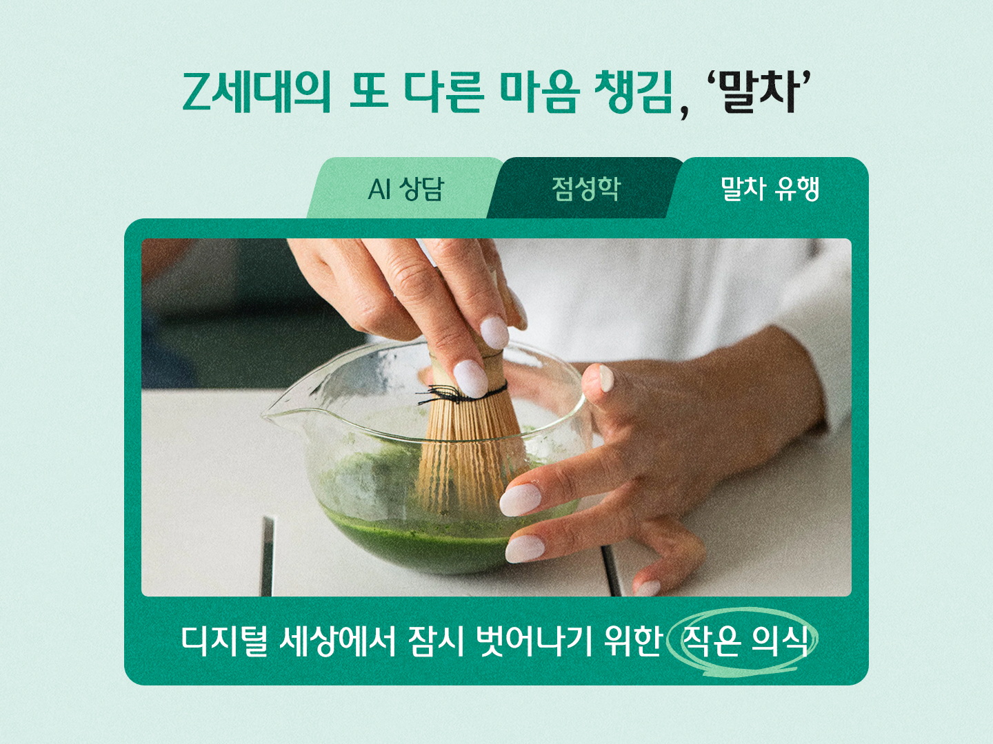 이처럼 젊은 세대는 AI 챗봇과 대화하며 위로를 받고, 에니어그램으로 자신의 본질적 성향을 이해하려 노력해요. 그리고 말차를 저으며 현실 세상의 몸과 마음을 다스리죠. 언뜻 보면 전혀 상관없어 보이지만, 이 모든 것들이 ‘내 마음을 더 잘 이해하고 싶다’는 시대의 목소리로 연결되는 거예요.🗣️