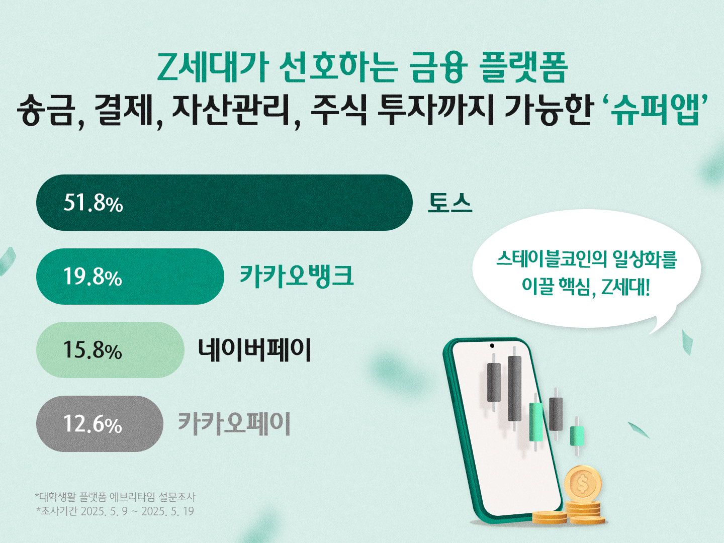 하지만 스테이블코인의 일상화를 이끌 핵심은 Z세대라는 의견이 많이 나와요. 올해 대학 생활 플랫폼 에브리타임이 실시한 조사에서 토스, 카카오뱅크, 네이버페이가 가장 쓰기 좋은 금융 플랫폼으로 이름을 올렸는데요. 앱 하나로 송금, 결제, 자산관리, 주식 투자까지 전부 가능하다는 ‘슈퍼앱’이라는 게 특징이에요.