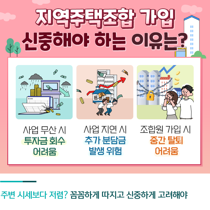 가파르게 상승하는 집값에 평범한 직장인들에게 내 집 마련은 점점 먼 꿈이 되어 가고 있는 현실입니다. 청약 또한 로또라는 말이 나올 만큼 경쟁이 치열합니다. 이렇게 내 집 마련이 힘들어지자 시세 대비 저렴한 가격을 내세우는 지역주택조합에 대한 관심이 높아지고 있습니다. 하지만 관련 피해 사례도 많아 주의가 필요한데요. 오늘은 하나은행 1Q블로그와 함께 지역주택조합의 장단점과 주의사항에 대해 알아보겠습니다.